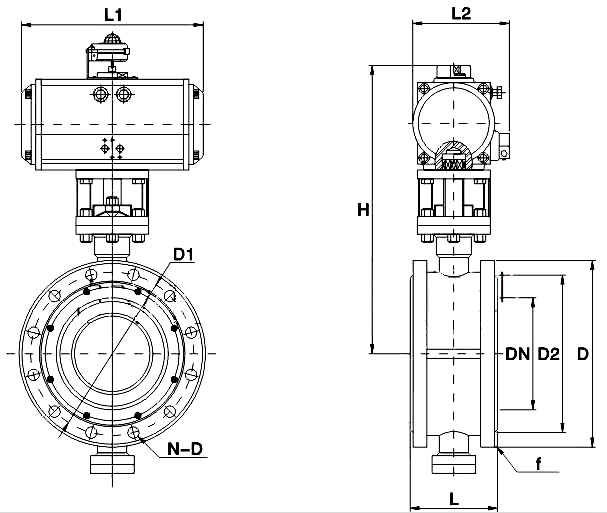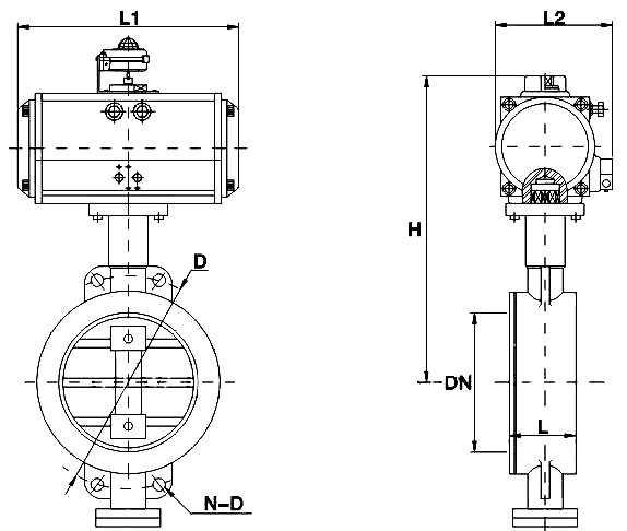 | DN | L | H | D | D1 | n-d | L1 | L2 | 氣動執(zhí)行器 (雙作用) | |