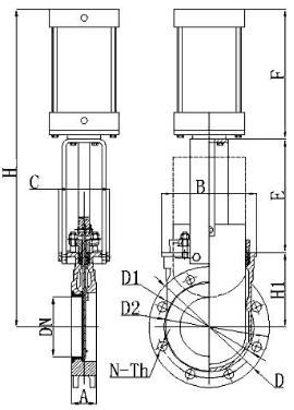 | DN | A | D | D1 | D2 | H | H1 | E | F | C | B | N-Th |