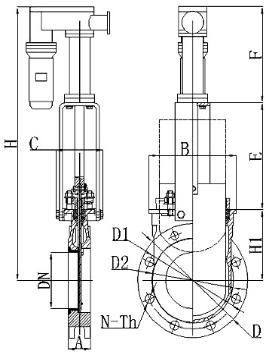 | DN | A | D | D1 | D2 | H | H1 | E | F | C | B | N-Th |